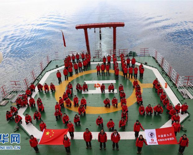 7月30日,中国第九次北极科学考察队在“雪龙”号科考船上展开五星红旗和考察队队旗。