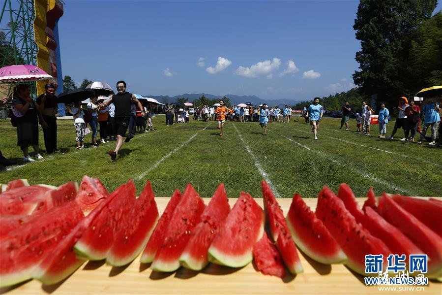 729日,在黄山市徽州区灵山村,游客参加西瓜趣味运动会。 当日,一场别开生面的西瓜趣味运动会在安徽省黄山市徽州区灵山村上演,人们参加吃瓜比拼、西瓜套圈、抱瓜赛跑等趣味比赛,欢乐度夏。 新华社发(施亚磊 摄)