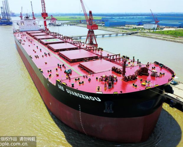 这也是该船“姊妹号”——“香港号”“深圳号”于4月28日、5月30日交付客户后,6艘40万吨级矿砂船中下水的第三艘。“广州号”轮长361.9米,宽65米,高30.4米,相当于10层楼的高度,其甲板差不多是3个标准足球场的大小,满载时达40万吨,结构吃水23米。 计海新/人民图片