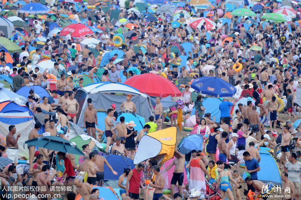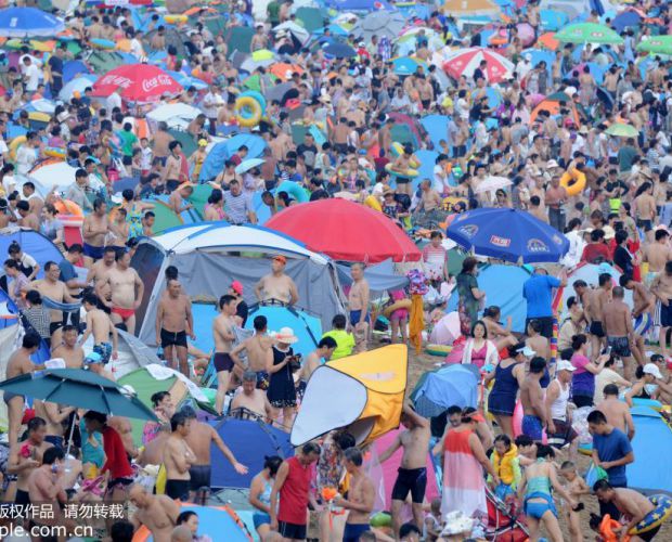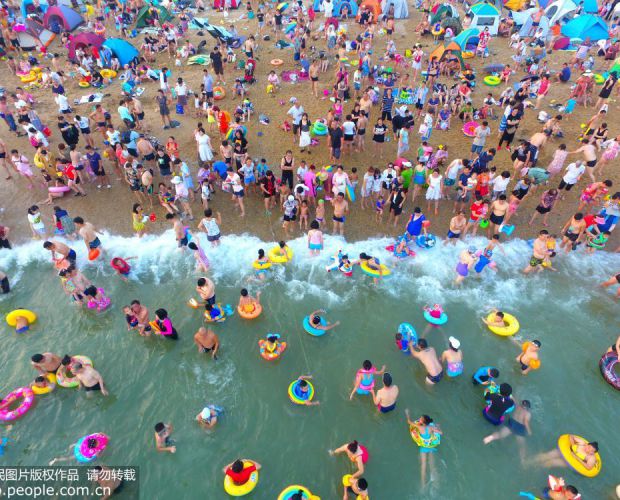 2018年8月5日,大连市各大海滨浴场迎来游客最高峰,距离大连市区最近的付家庄海滨浴场的游客更是密密麻麻,4万多名游客挤满在长450米,宽32米的沙滩上,创下该浴场夏日游客最高峰。卢国忠/摄