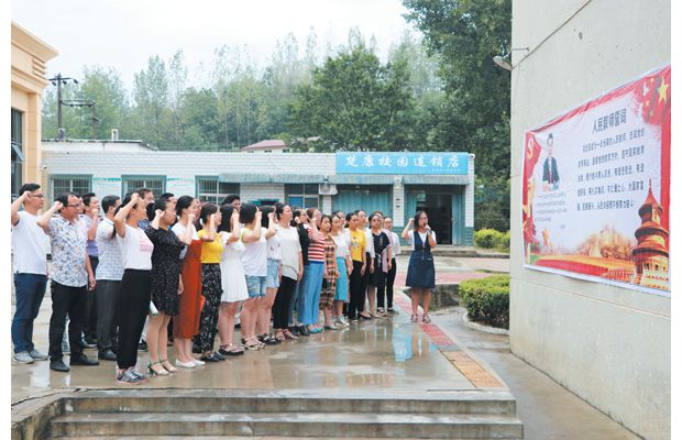 随州网讯 “我志愿成为一名光荣的人民教师……”在第34个教师节来临之际,曾都区洛阳中心学校组织全体教师举行宣誓活动,掀起了争做“四有”好老师的热潮。(通讯员 任绍星 赵正勇 孙晓峰摄)