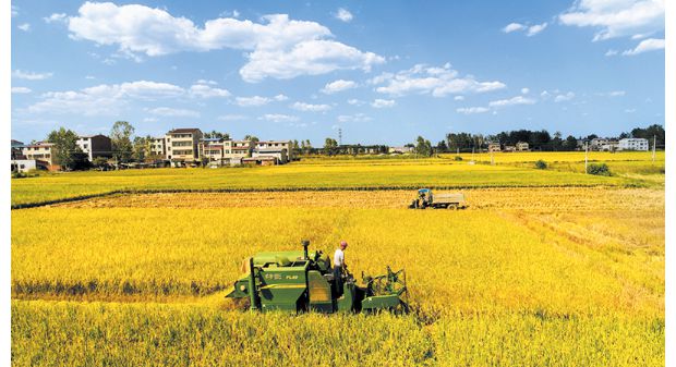 随州网讯 金秋时节,随州大地一片金色的美丽丰收景象。目前,全市各地正在组织抢收抢割水稻,确保颗粒归仓。(本报记者 李文军摄)