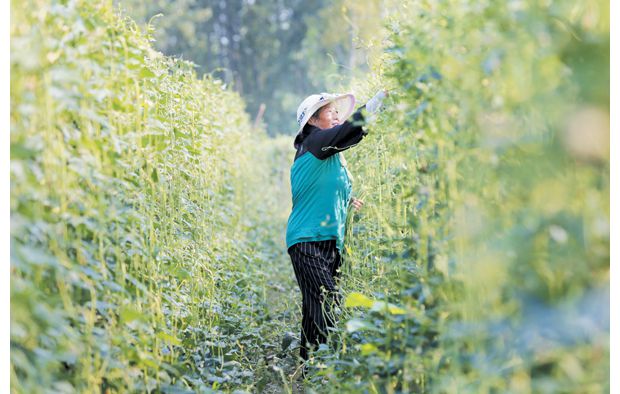 随州网讯 曾都区万店镇黄家畈村流转土地100亩发展蔬菜种植项目,帮助贫困户43户129人,人均增收800多元。图为在打工的村民在蔬菜基地采摘豇豆。(本报记者 徐斌 摄)