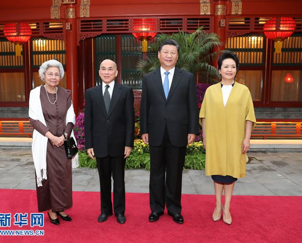 9月19日,在中秋佳节来临之际,国家主席习近平和夫人彭丽媛在钓鱼台国宾馆亲切看望正在北京休养的柬埔寨国王西哈莫尼和太后莫尼列。新华社记者 黄敬文 摄
