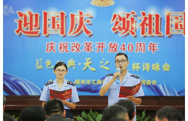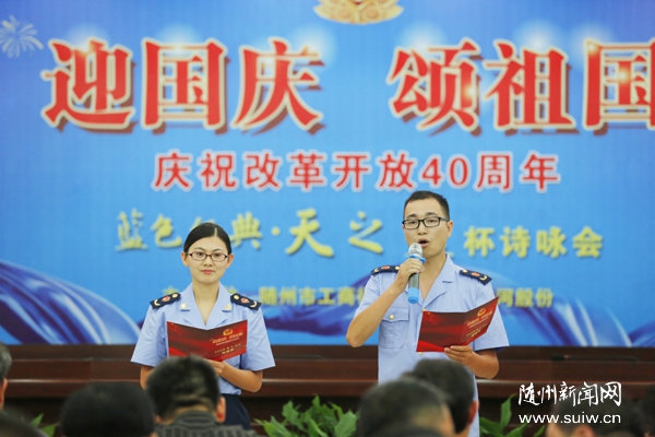 随州新闻网讯 9月25日,市工商局联合洋河股份(苏酒集团)举办迎国庆 颂祖国·庆祝改革开放40周年诗咏会,来自市工商局及直属分局的16名选手以诗歌抒怀言志,向祖国69岁生日和改革开放40周年献礼。(本报记者 徐斌 通讯员黄霞摄)
