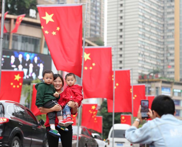 2018年9月26日,重庆市沙坪坝区三峡广场商圈,鲜艳的五星红旗迎风飘扬,喜迎国庆。陶廉/东方IC