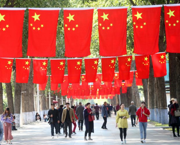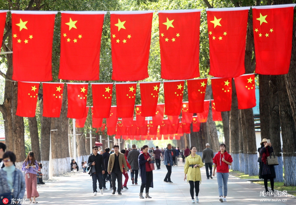 2018年9月26日,哈尔滨市道里区江畔公园内挂起了数百面五星红旗,吸引了许多市民和游客驻足观看拍照。成蔷/东方IC