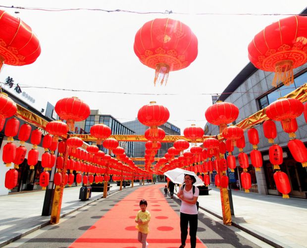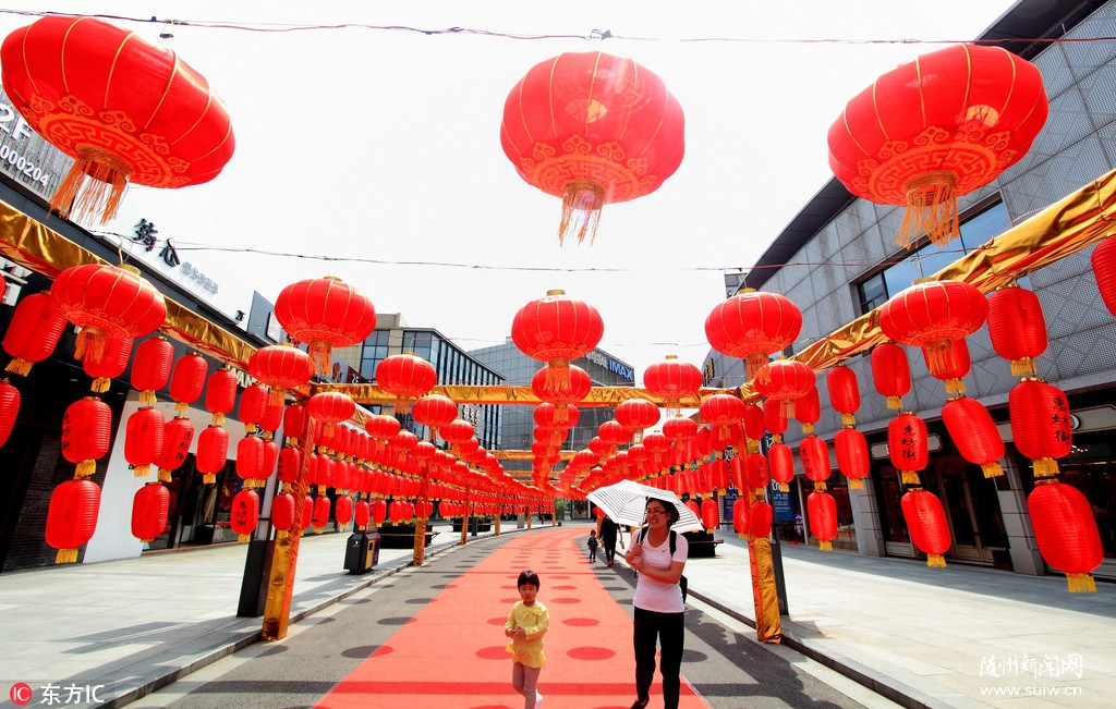 2018年9月26日中午,几位市民正在浙江绍兴市区街头观赏着悬挂的数百只红灯笼。李瑞昌/东方IC