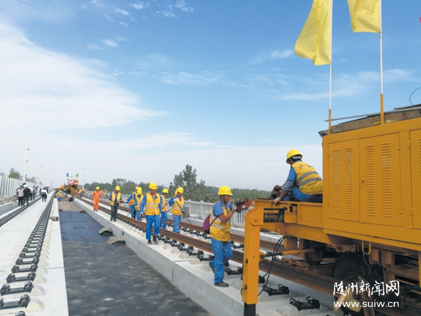 随州新闻网讯 记者冯家园、通讯员杨延兵报道:伴随着牵引车缓慢前行,长500米的钢铁长轨准确落入道板床上。9月30日,在汉十高铁随县站,中铁十一局的工人们正在紧张地铺设轨道(如图)。按计划,本月中旬可完成随州段的轨道铺设。
