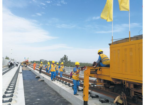 据介绍,汉十高铁铺轨运用我国自主研发生产的铺轨机,每天可铺轨9公里。无砟钢轨由宝武钢铁集团生产,出厂时每段长100米,在武铁轨道工厂焊接成铺轨时所用的500米长钢轨。记者在枣阳的钢轨场看到,一眼望不到头的钢轨整齐地堆放着,几十个龙门吊依次排列,同时吊起一根根钢轨放到火车上。
