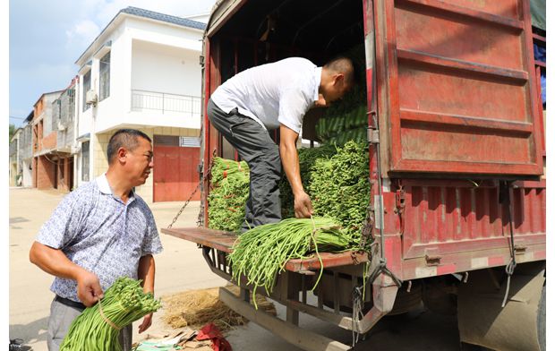 随州新闻网讯 曾都区万店镇黄家畈村依托资源优势,着力发展蔬菜种植项目,一年四季接茬轮番种植,帮助村民脱贫致富。图为连日来村民忙着装运秋豇豆销往外地。(本报记者 唐天才 特约记者 张立摄)