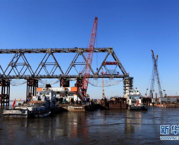 这是10月13日拍摄的同江中俄铁路大桥的中方建设部分。 10月13日上午,中俄同江-下列宁斯阔耶铁路桥重要组成部分——黑龙江特大桥中方最后一吊钢梁安装到位,标志着同江中俄铁路大桥中方段主体工程全部完成。 同江中俄铁路大桥工程于2014年2月26日奠基,是中俄首座跨界河铁路大桥,设计铁路年过货能力2100万吨。大桥全长7193.71米,其中跨江大桥主桥全长2215.02米,中方境内1886.45米,俄方境内328.57米。 新华社记者 马知遥 摄