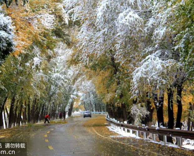 随着一股冷空气光临新疆北天山,天山天池景区降下了入秋以来的首场大雪,五彩斑斓的秋景与白雪构成了最美的降雪季。 甄梅/人民图片