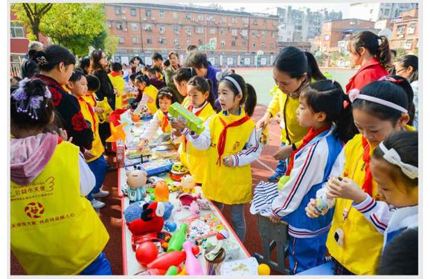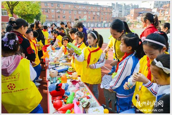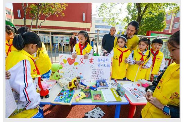 随州新闻网讯 曾都区东莞学校的小学生们自发在校园“跳蚤市场”举行爱心义卖活动,将自己的旧书籍、旧文具、旧玩具、手工制品等出售,将筹集的爱心款全部捐赠给曾都区万店镇的贫困儿童。(本报记者李文军摄)