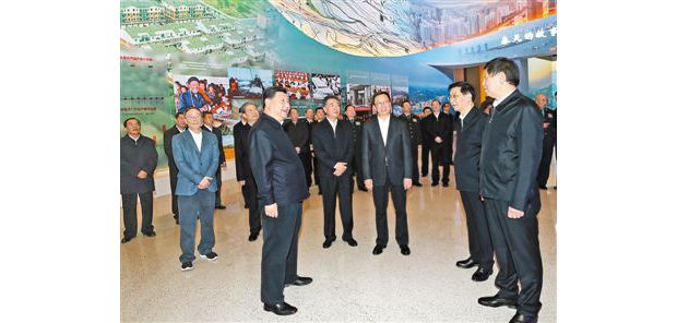 党的十一届三中全会等反映党中央推进改革开放重大时间节点、重大历史事件、重大决策部署的历史照片,拉开中国农村改革大幕的安徽小岗村18位农民按下包产到户“红手印”的雕塑,长征系列运载火箭、天宫号空间站等模型,体现40年来经济建设、政治建设、文化建设、社会建设、生态文明建设历史性成就与变革的实物和资料,呈现全面推进国防和军队现代化、推动全方位对外开放、加强和改进党的建设等图片……逼真的实物模型、详实的图片图表、丰富的视频资料,吸引了习近平等领导同志的目光,他们不时停下脚步仔细观看,听取工作人员讲解,并询问有关情况。