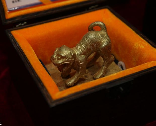 近日,四川彭山江口明末战场遗址2017-2018年水下考古发掘文物展出。此为展出的一枚蜀王金宝。据明史记载,皇子封亲王,授金册金宝。世子承袭王位,止授金册,传用金宝,也就是说每个藩王府只有唯一一枚金宝,因此较金册显得更为稀少和珍贵。本次发掘出水的这枚金宝,虽然残损,但可清楚的辨识出印面的篆书蜀字,当来自蜀藩王府。张忠苹/东方IC