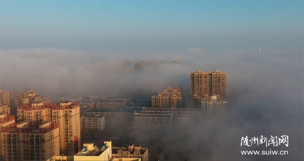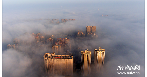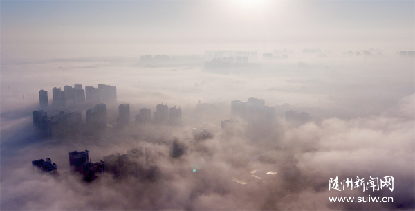 随州新闻网讯  11月19日早晨,雨后初晴的随城被大雾笼罩,无人机从200米高空俯瞰随城,烟雾缭绕,宛若仙境。