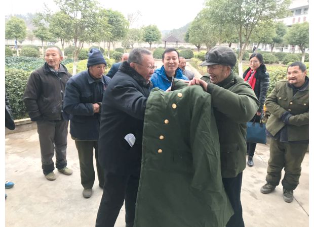 随州新闻网讯 连日来寒风呼啸,冷气袭人。本报曾经报道过的“最美门卫爷爷”蒋从洪牵挂着福利院孤寡老人冷暖,他又拿出省吃俭用的10000元上街购买了100件棉大衣和100双棉鞋,12月6日,专程送到曾都区何店镇福利院孤寡老人手中。图为蒋从洪(前左)为老人穿大衣。(随州日报全媒体记者 唐天才 通讯员 朱道全摄)