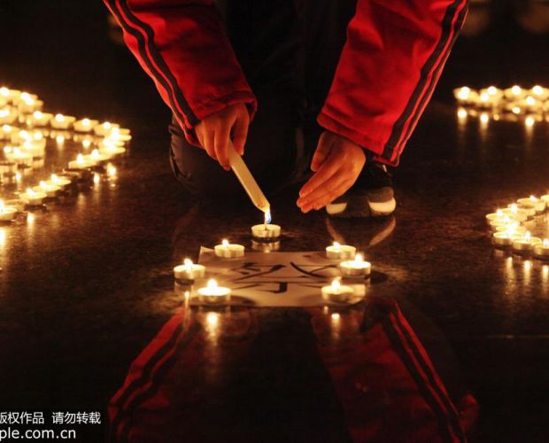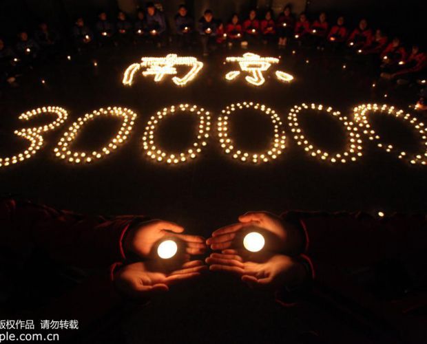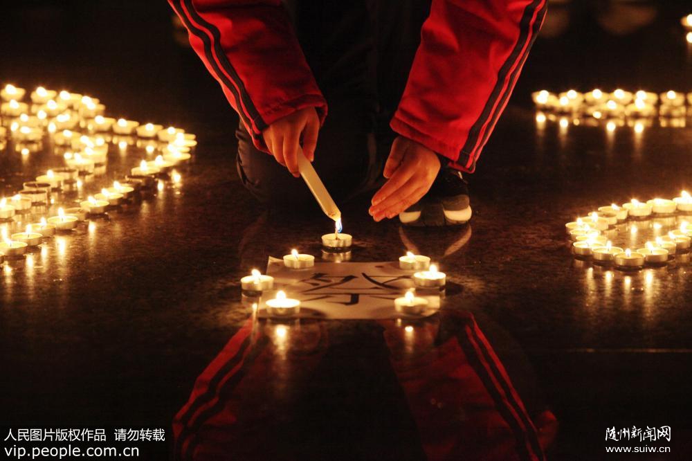 2018年12月12日晚,江苏扬州新华中学的学生在校园举行“烛光点点寄哀思——公祭南京大屠杀死难者”活动,悼念南京大屠杀遇难同胞。同学们点燃摆成心形图案和“南京”字样的蜡烛,在烛光中默哀祈祷,表达对南京大屠杀遇难同胞的哀思,祈祷世界和平。(孟德龙/人民图片)