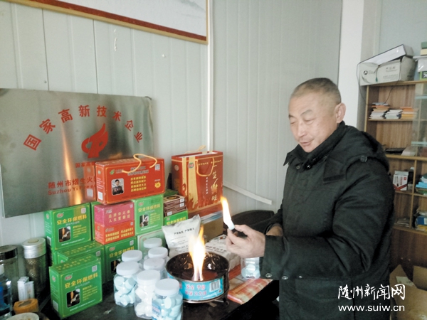 图为随州市熠生火新能源公司董事长席世荣展示他发明的安全环保燃料和节能灶具。 (随州日报全媒体记者 王董斌摄)