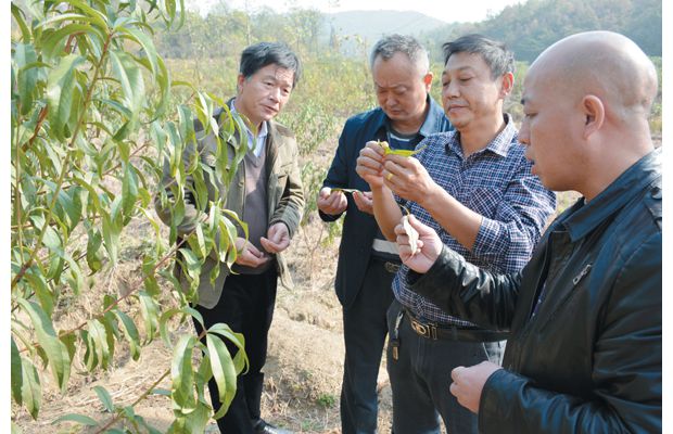 随州新闻网讯 近日,曾都区组织一批科技特派员深入省级重点贫困村——洛阳镇黄金堂村科技帮扶,为贫困户种植的桃树、李树、香菇把脉问诊、解难释惑,助力脱贫攻坚。图为科技特派员指导村民防治桃树病虫害。(随州日报全媒体记者唐天才、通讯员王江威摄)