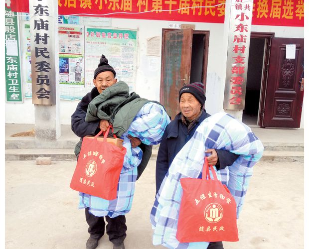 随州新闻网讯 寒冬时节,随县殷店镇小东庙村驻村工作队和村“两委”想困难群众之所想,及时将御寒棉被、棉衣、棉鞋送到五保老人手中,让他们安然度过一个“温暖”的寒冬。(随州日报全媒体记者林超摄)