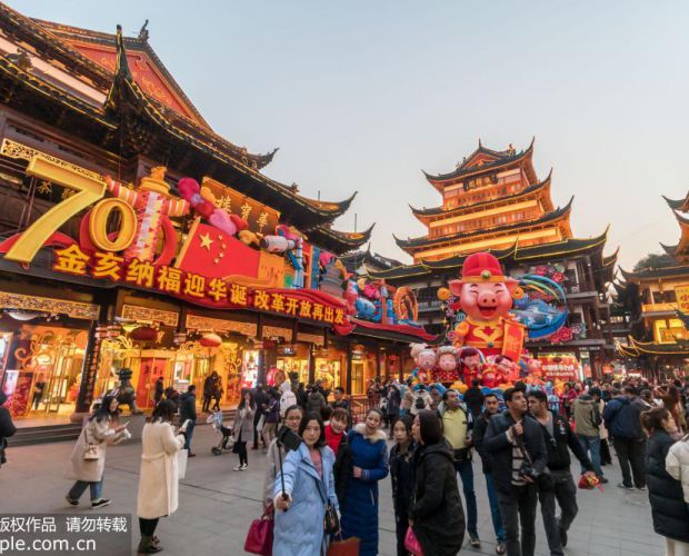 当天黄昏的豫园商城内游客如织,中心广场上今年的主灯巨型生肖猪灯已经安装完毕,许多游客驻足观赏拍照。这只巨型生肖猪咧嘴大笑,造型颇为喜庆,手上还拿着金元宝和福字。此外在黄金广场上,一只小猪"腾云驾雾"般地站在一只狮子上,喜庆洋洋地拿着灯笼,一旁还立有金钱树和元宝车,左侧的商户楼上更是挂上了一头金色的“飞猪”和财神,预示着来年财源广进。据悉,今年的豫园新春灯会将在本月下旬亮灯迎客。王冈/人民图片