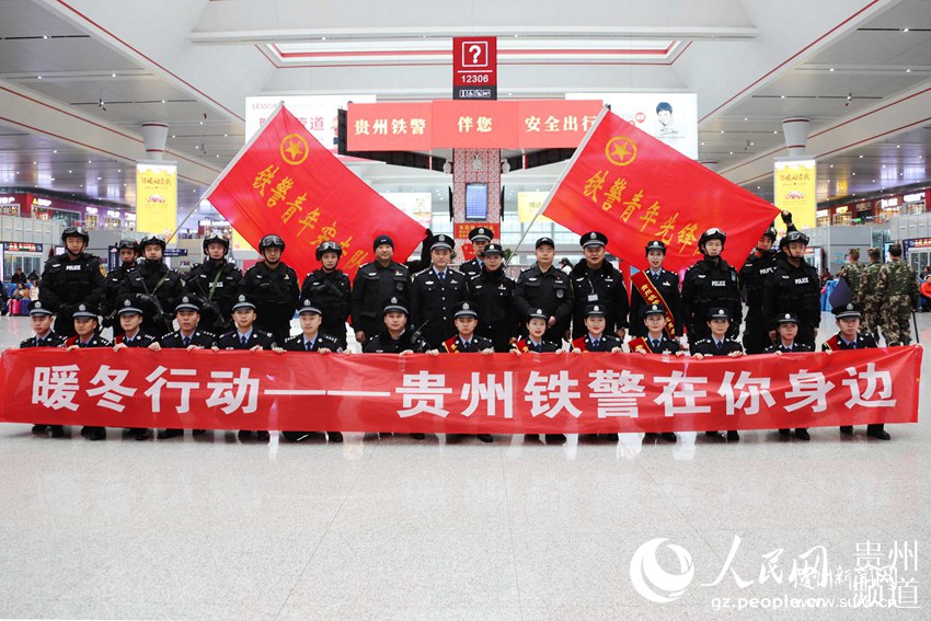 人民网贵阳1月21日电 1月21日,2019年春运拉开帷幕。上午9时,贵阳北站候车大厅,一场以“暖冬行动——贵州铁警在你身边”为主题的志愿服务活动正式开始。