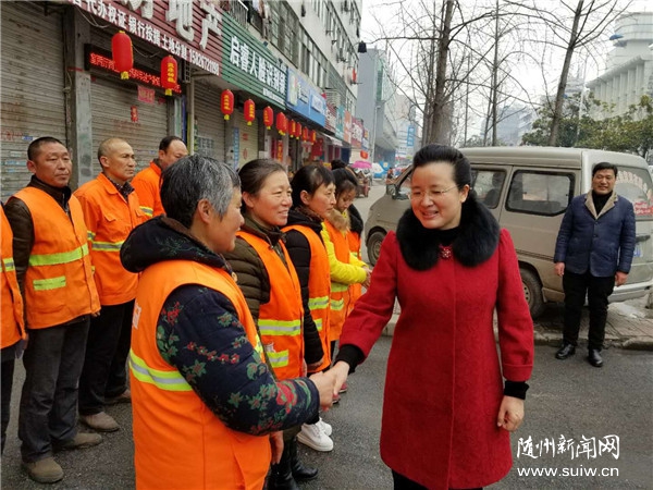 上午8时35分,随州城区汉东路,10多名环卫工人已经清扫完整条街道,郭永红等市领导走上前去,亲切向他们打招呼并一一握手。郭永红说,近年来随州城市环境有很大改善,环卫工人作为城市的美容师,发挥了至关重要的作用,感谢大家所付出的辛勤和汗水。我代表市委市政府向你们拜年,并通过你们向你们的家人表示衷心的感谢,祝大家春节全家幸福,合家欢乐。