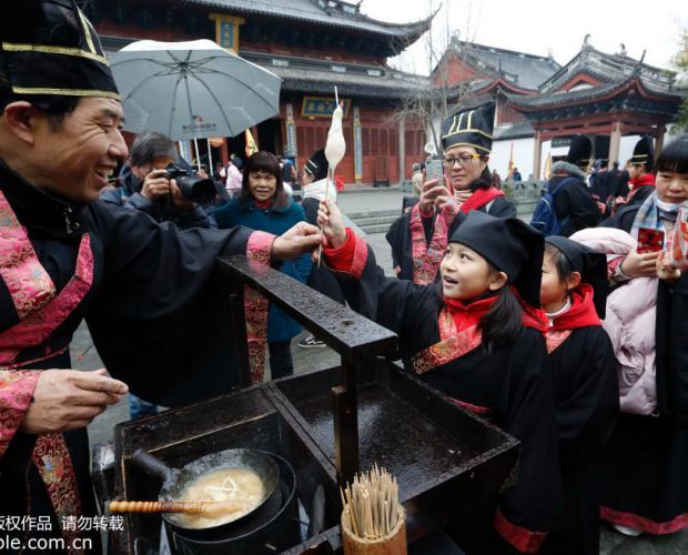 2019年2月17日,“寻梦宋都”己亥年南宋市集暨孔庙元宵游园会在杭州清波街道举行。市民们换好一身宋服,在庙会上猜灯谜、拔河、踩高跷、画糖画、滚铁环……其乐融融。吴煌/人民图片