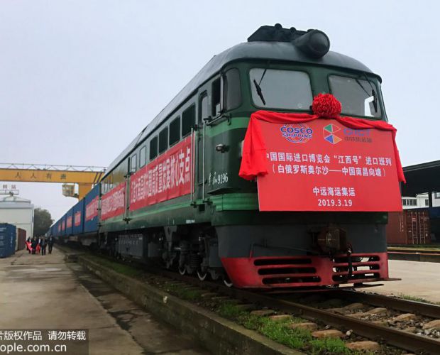 2019年3月19日,由白俄罗斯奥尔沙开出的中欧班列抵达江西南昌向塘铁路口岸。与此同时,由南昌出发前往白俄罗斯奥尔沙的中欧班列即刻启程,标志着江西首条“点对点”双向中欧班列开通。