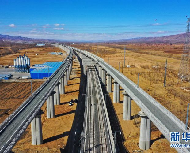 由中铁二十二局集团承建的大张高铁河北段(3月21日无人机拍摄)。3月21日,大(同)张(家口)高铁控制性工程大梁山隧道贯通,标志着2022年北京冬奥会重要配套工程大张高铁线下工程完工,为年底开通奠定了坚实基础。通车后,从大同乘高铁到张家口需40分钟左右,大同至北京的列车运行时间将从6个小时压缩至100分钟左右。 新华社记者邢广利摄