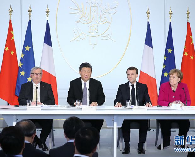 3月26日,国家主席习近平在巴黎同法国总统马克龙一道出席中法全球治理论坛闭幕式。德国总理默克尔、欧盟委员会主席容克应邀出席。 新华社记者 鞠鹏 摄