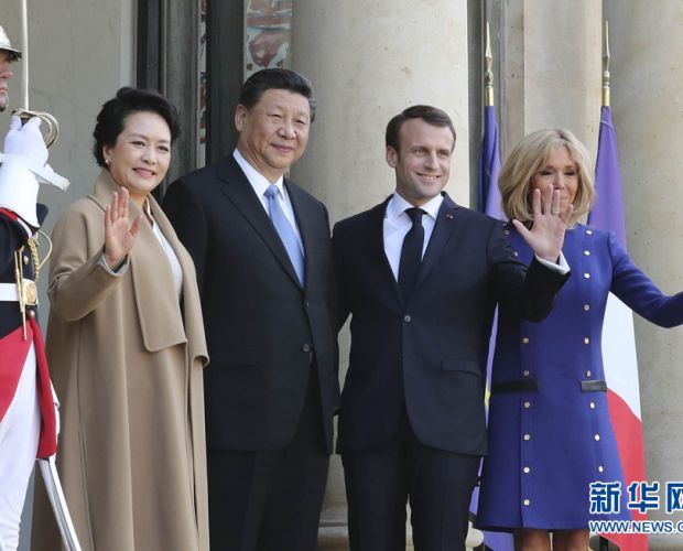 3月26日,国家主席习近平结束对法国的国事访问。离开巴黎前,习近平和夫人彭丽媛出席法国总统马克龙夫妇在爱丽舍宫举行的隆重欢送仪式。这是习近平和彭丽媛同马克龙夫妇亲切话别,合影留念。 新华社记者 丁林 摄