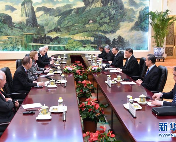 “元老会”主席、爱尔兰前总统鲁滨逊,“元老会”副主席、联合国前秘书长、博鳌亚洲论坛理事长潘基文,墨西哥前总统塞迪略代表“元老会”代表团先后发言。他们首先祝贺中华人民共和国成立70周年以及中国经济社会发展取得的巨大成就,高度评价中方的环保、脱贫和民族工作。他们表示,在多边主义面临挑战的严峻时刻,中国发挥着负责任的建设性作用。中国始终坚持《联合国宪章》的宗旨和原则,积极帮助非洲的和平与发展事业。习近平主席在国际场合的一系列重要讲话向国际社会发出了积极信息。我们要坚定维护以联合国为核心的多边体系,加强在国际和地区安全、应对气候变化等领域的多边合作,期待着中国继续发挥领导作用。