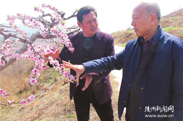 随州日报讯  3月25日,随州市、随县老促会负责人深入随县华宝山水果农民专业合作社调研,听取果树专家讲解适时对桃树间花疏果,以提高桃子品质,达到增产增收的目的。(随州日报通讯员 刘婷婷摄)