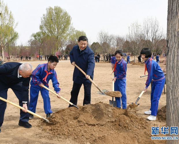 4月8日,党和国家领导人习近平、栗战书、汪洋、王沪宁、赵乐际、韩正、王岐山等来到北京市通州区永顺镇参加首都义务植树活动。这是习近平同大家一起植树。 |