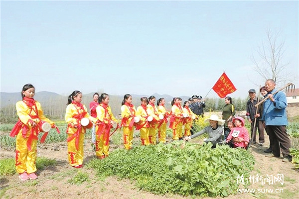 随州日报讯  近日,武汉铁路公安处广水车站派出所民警与广水市武胜关镇孝子中心小学、广水办事处第一完全小学的老师们,带领一支由20余名小学生组成的腰鼓队,到武胜关孝子店村开展爱路护路安全常识宣传活动。(随州日报通讯员 刘潇、冯畅、周磊摄)