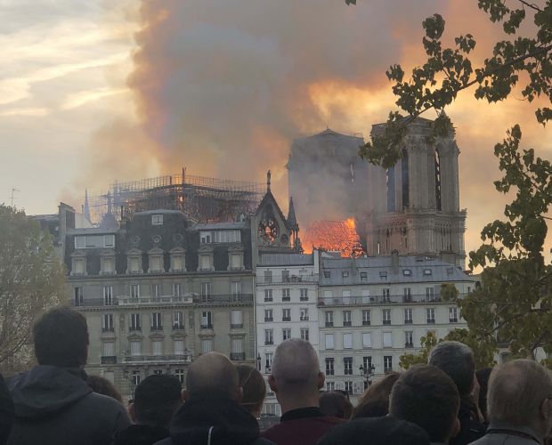 目前,教堂屋顶大部正燃起巨大火苗,塔尖在大火中倒塌。