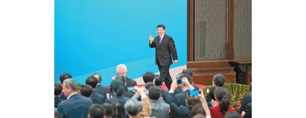 四月二十七日,第二届“一带一路”国际合作高峰论坛在北京雁栖湖国际会议中心举行圆桌峰会,国家主席习近平主持会议并致开幕辞。圆桌峰会闭幕后,习近平会见中外记者,介绍第二届“一带一路”国际合作高峰论坛圆桌峰会情况和主要成果。这是习近平步入记者会现场。 |