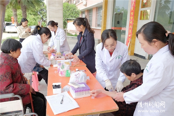 随州日报讯 5月7日,曾都区红十字会、群众艺术馆的卫生、文化志愿者们共同走进楚缘生态养老院,开展2019年红十字博爱周“爱心相伴‘救’在身边”活动,为老人们进行了文艺演出慰问和健康体检活动。(随州日报全媒体记者 李文军、通讯员 王义彬摄)