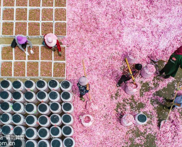 2019年5月15日,江苏省宿迁市泗阳县卢集镇万亩玫瑰花海进入盛花期,花海中,花农们正在采摘玫瑰花。旁边的收购点上,工人们正忙着往桶里灌装花瓣,花农们也在排着长队交售刚采摘的花蕾。
