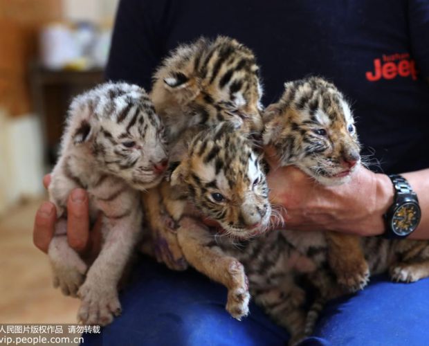近日,在山东省荣成市西霞口神雕山野生动物园里,一只雌性孟加拉虎诞下四只虎宝,其中一只为珍稀的白虎,三只为孟加拉虎。目前,虎宝们体征平稳,主食奶粉,动物园正在急寻一只刚产崽的母狗,希望由狗妈哺乳它们。
