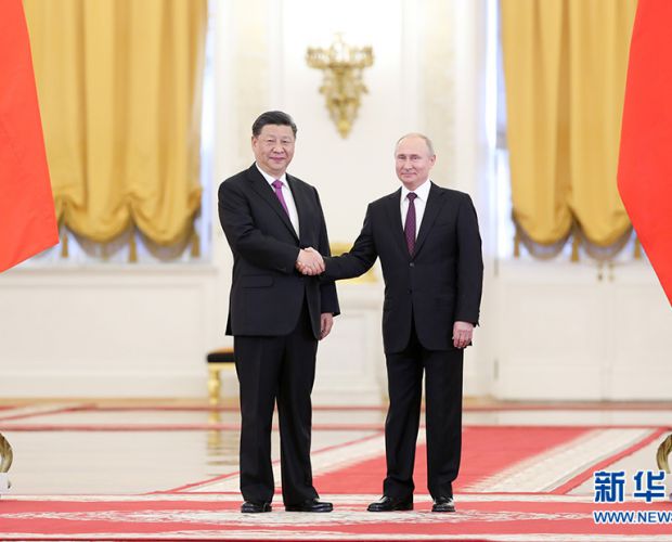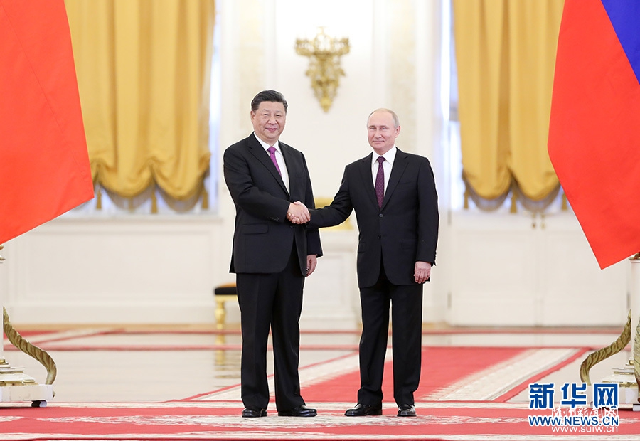 6月5日,国家主席习近平在莫斯科克里姆林宫同俄罗斯总统普京会谈。这是会谈前,两国元首紧紧握手,合影留念。 新华社记者 丁海涛 摄