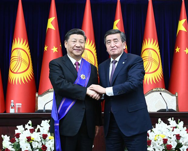 6月13日,国家主席习近平在比什凯克出席仪式,接受吉尔吉斯斯坦总统热恩别科夫授予“玛纳斯”一级勋章。 |