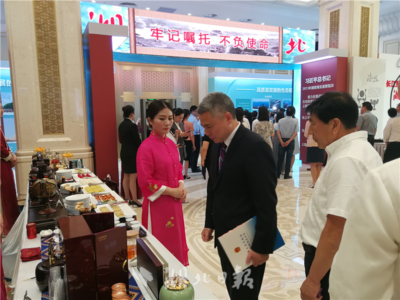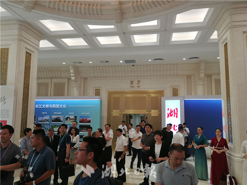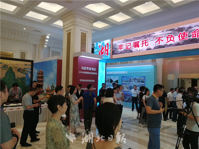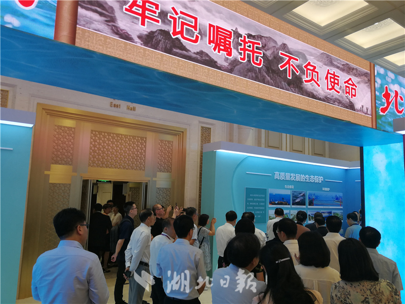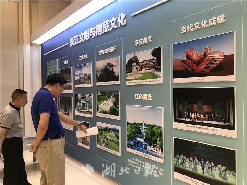 在大厅四周,一个个丰富详实的展板以“五大发展理念”为主线,充分展示湖北与长江经济带、高质量发展的创新驱动、高质量发展的生态保护、高质量发展的开放引领、高质量发展的幸福生活、长江文明与荆楚文化等方面的成就。吸引了人们驻足观看。