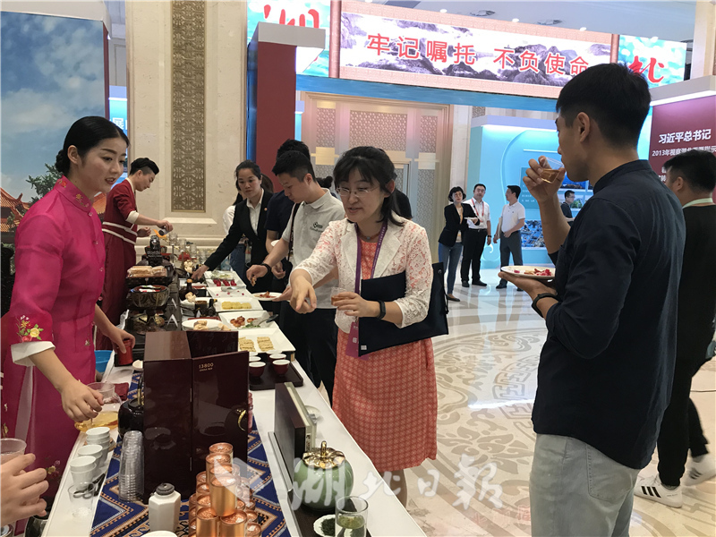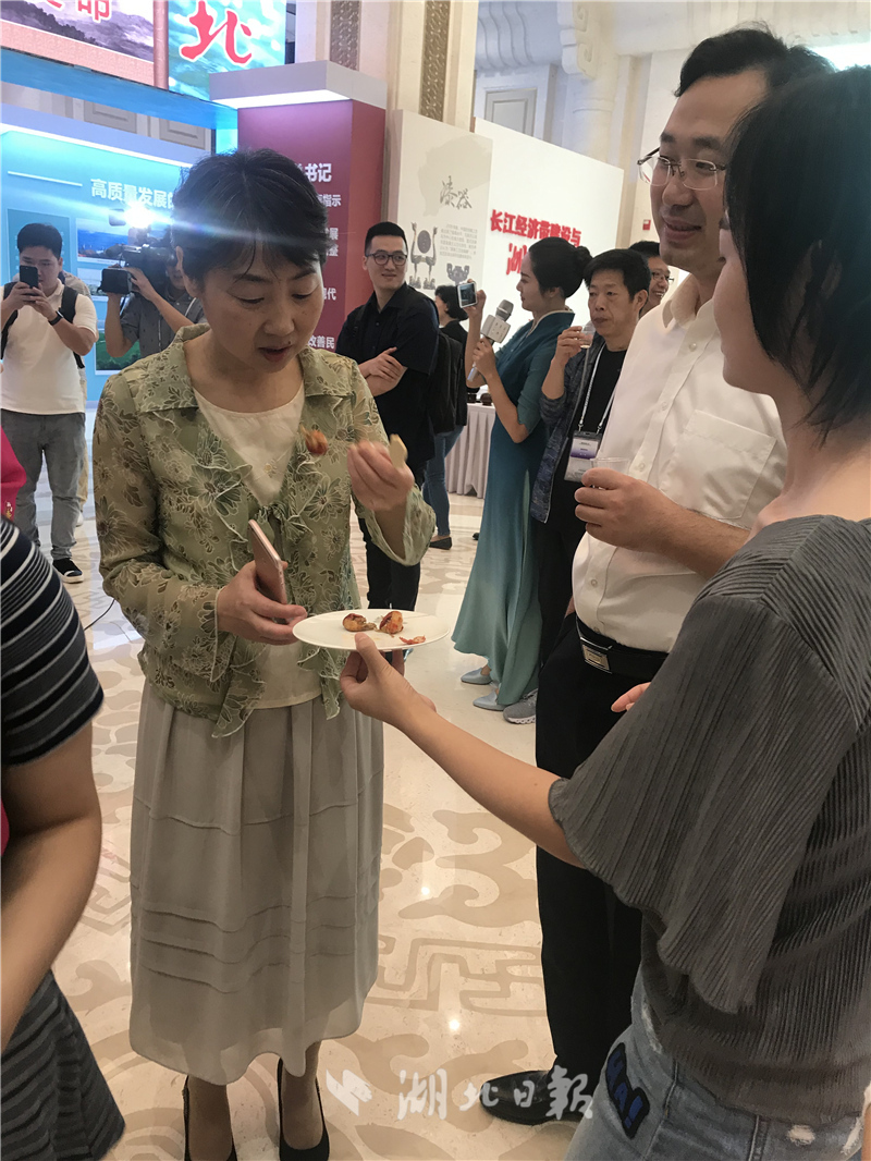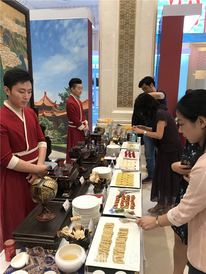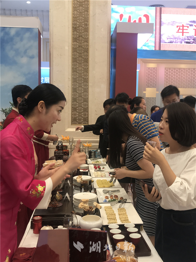 今天展厅内人气最高的,莫过于这一块区域了。你别看它小,在这里,人们不仅可以品尝到襄阳小麻花、潜江小龙虾、咸宁桂花糕、洪湖鲜藕带、十堰魔芋等湖北特色小吃,还能吃到网红食品“荆州芈月糕”,据说这个是芈月娘娘钟爱的同款糕点,很多来宾一边吃一边赞不绝口。