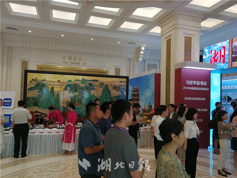 今天,国务院新闻办公室新闻发布厅正式进入“湖北时间”。此时此刻,与会嘉宾、媒体已经在陆续签到进场。记者了解到,今天的展览分为“图文板块”“非遗板块”“实物板块”三大板块,全面展示湖北的文化、科技、开放和生态等领域的举措和成就。一进入发布厅,浓浓的荆楚风扑面而来。