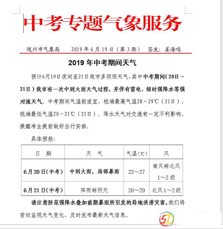 注意啦!随州中考期间有大雨,请考生提前做好出行安排