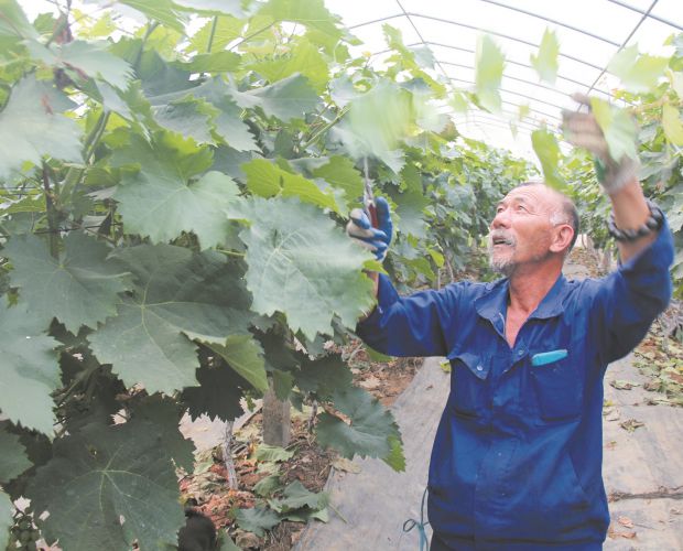6月21日,曾都区政协组织科技界专家技术人员到随州市盛亩园农民科技有限公司果园进行技术指导,以提高鲜果品质,增加果农收入。图为果农应用学到的技术为葡萄剪枝去杂。 (随州日报通讯员刘毓、多思摄)
